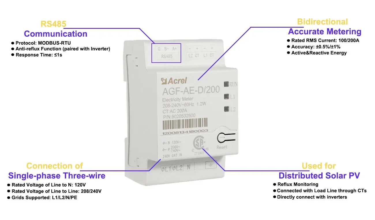 Bidirectional Metering ● Active&Reactive Energy Metering ● Rated RMS Current: 100/200A ● Accuracy: ±0.5%/±1% |